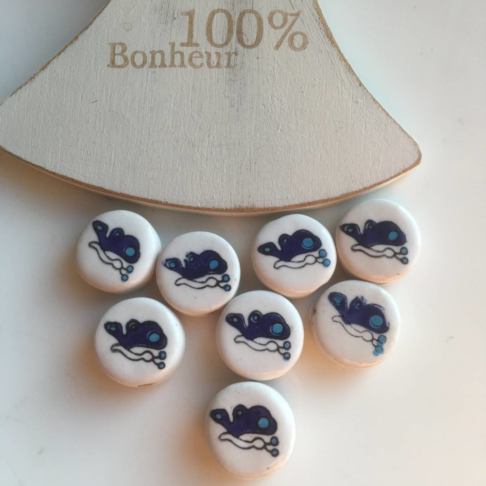 Ce lot est composé de 10 perles rondes en porcelaine (percées de part en part) fond blanc et dessins de papillons en bleu . diamètre = 1,2cm , diamètre du trou = 3mm, épaisseur de la perle = 0,8cm