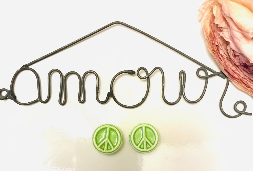 Ce Duo de perles rondes en céramique 15mm peace vert est troué de haut en bas, plusieurs coloris différents en boutique, idéal pour des créations de bijoux