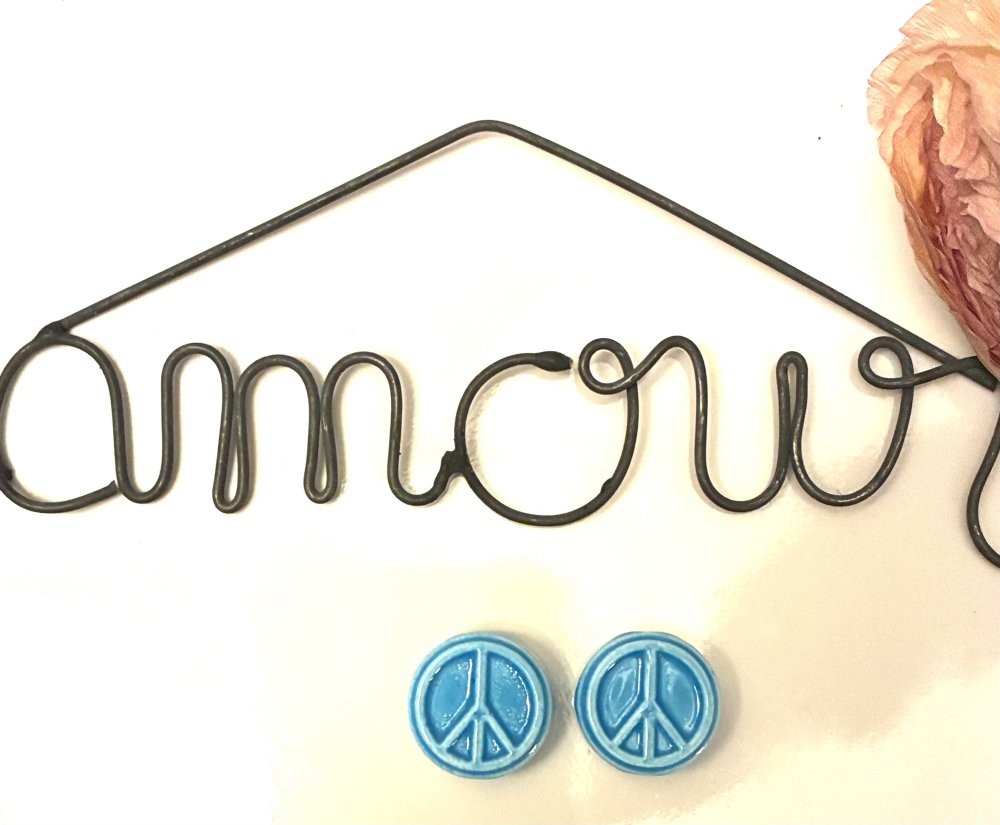 Ce Duo de perles rondes en céramique 15mm peace bleu est troué de haut en bas, plusieurs coloris différents en boutique, idéal pour des créations de bijoux