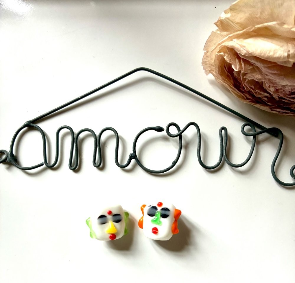 Duo de perles en verre tête de japonais orange, blanc et vert