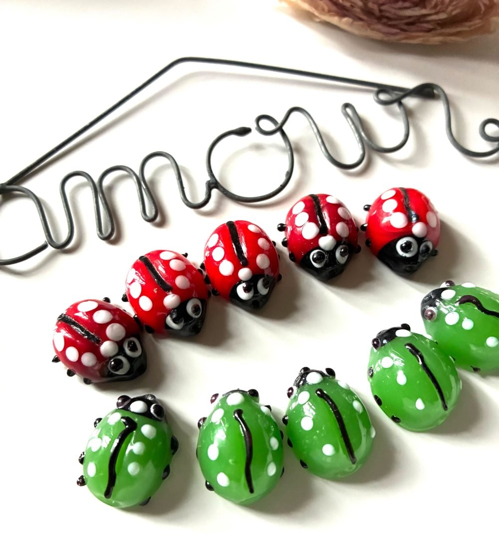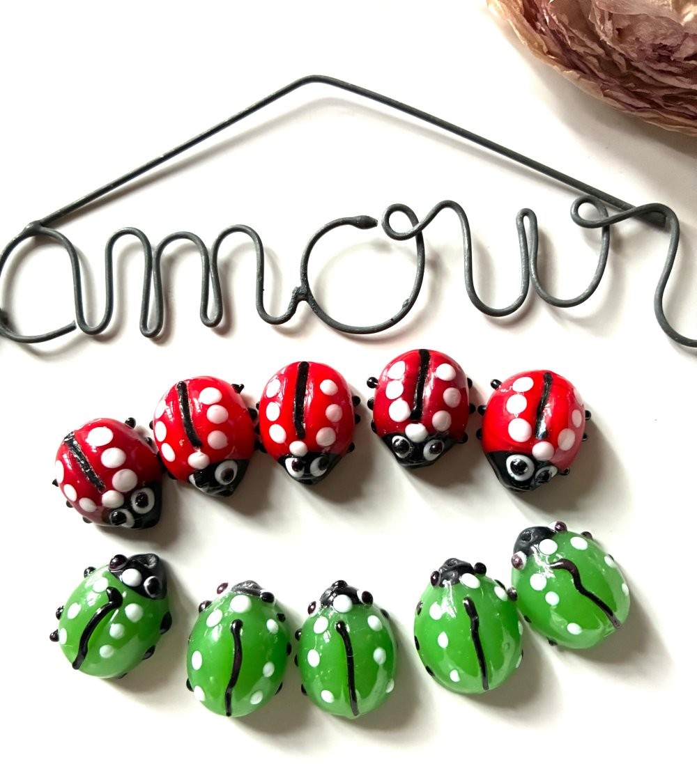 Ces 10 perles plates et trouées en forme de coccinelles mesurent 19x16x10mm, d'autres coloris en boutique