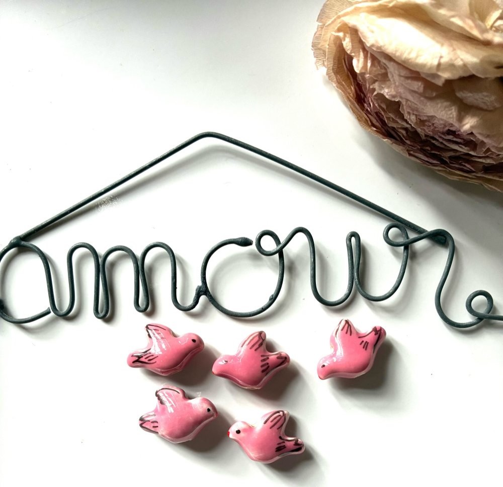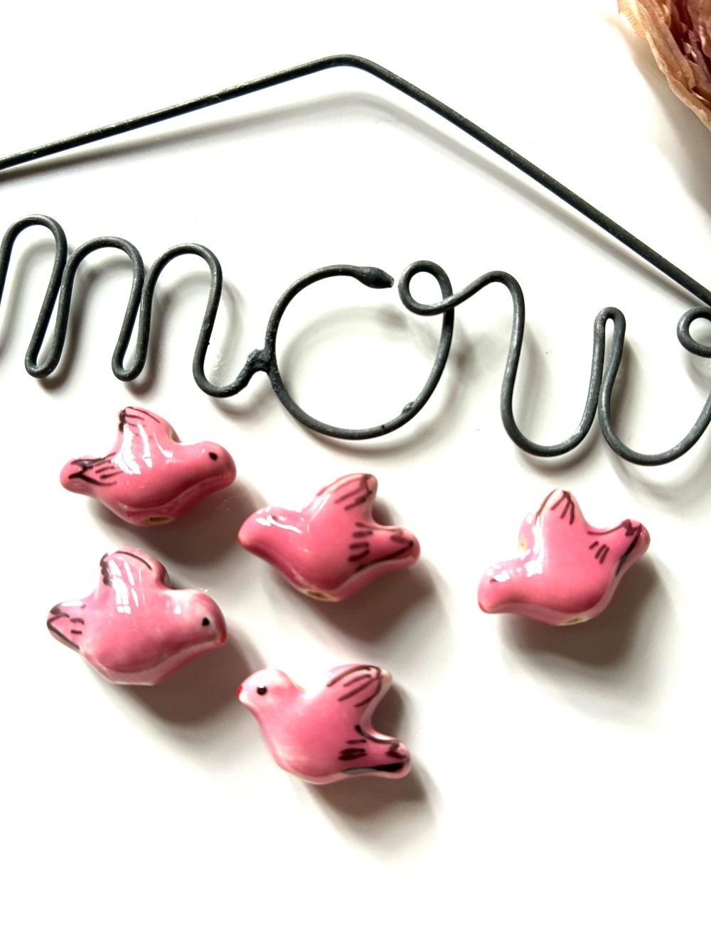 Ce lot est composé de 5 perles oiseaux en porcelaine (trouées de part en part) en vieux rose. dimension 1,8cmx1,5cm. Existe en rouge, blanc, noir, bleu ciel