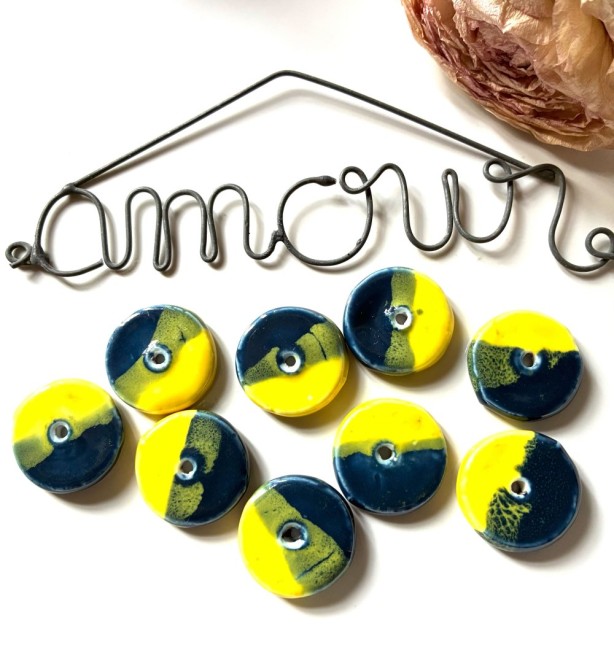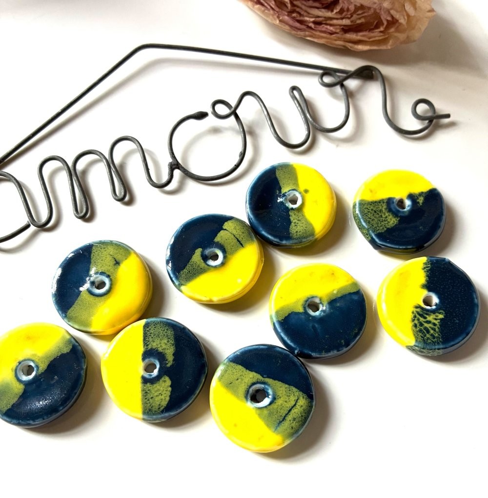 Lot de 10 perles en forme de disque de couleur bicolore jaune-bleu. Dimension = diamètre : 2 cm, trou 0,3 cm, + 1 offerte Plusieurs coloris en boutique