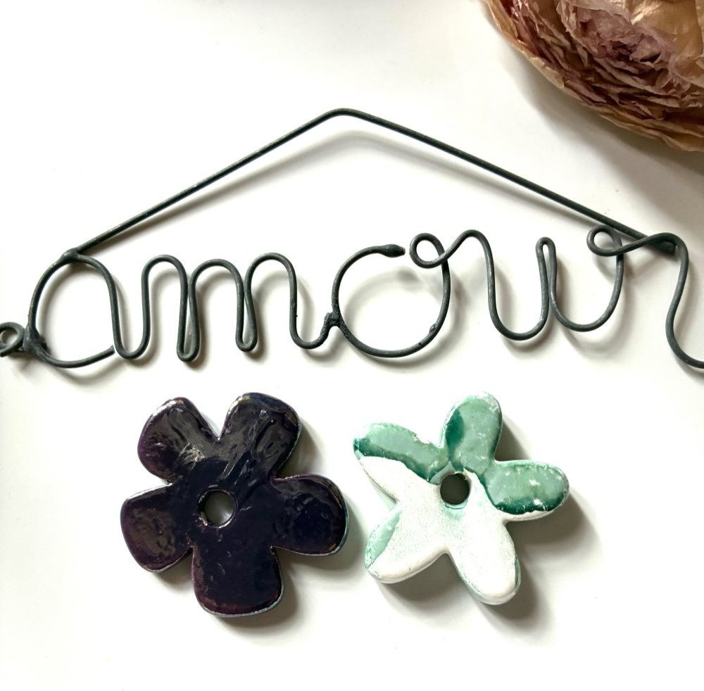Ces deux perles en céramique en forme de fleur en violet et vert d'eau mesurent 3,5cm de diamètre, le trou central mesure 5mm.