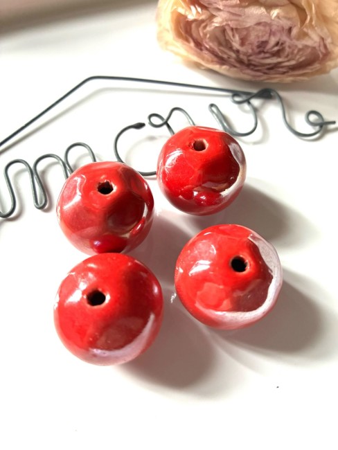 Ce lot est composé de 4 perles en céramique rondes, diamètre 2,4cm, diamètre du trou 3mm, en rouge avec un effet martelé.