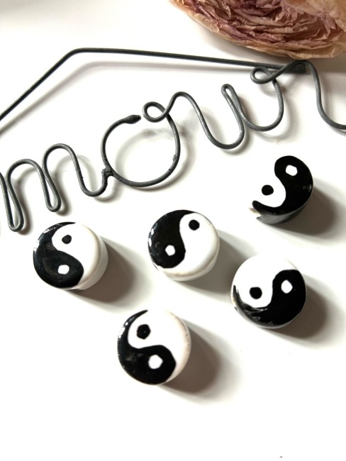 Ces 5 de perles rondes en céramique 14mm de diamètre Le Yin et le Yang épaisseur de la perle 8mm, percées trou = 2mm