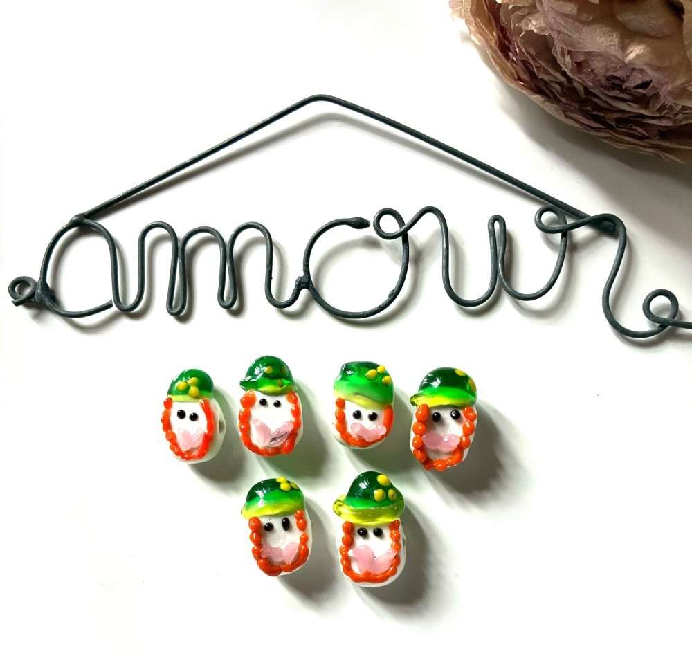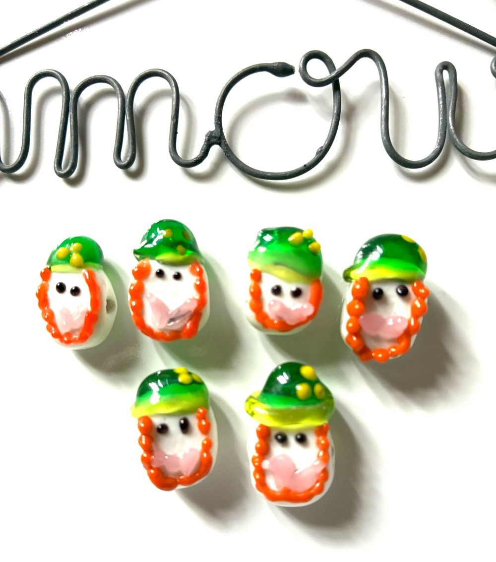 Ce lot est composé de 6 perles blanches, en céramique avec un décor de tête de leprechaun, symbole de la saint Patrick. La perle mesure : 17mmx10mm, percée sur le côté, avec chapeau, barbe rousse.