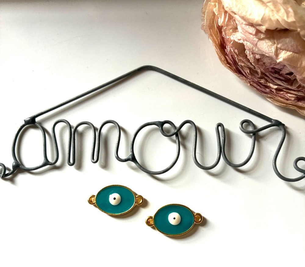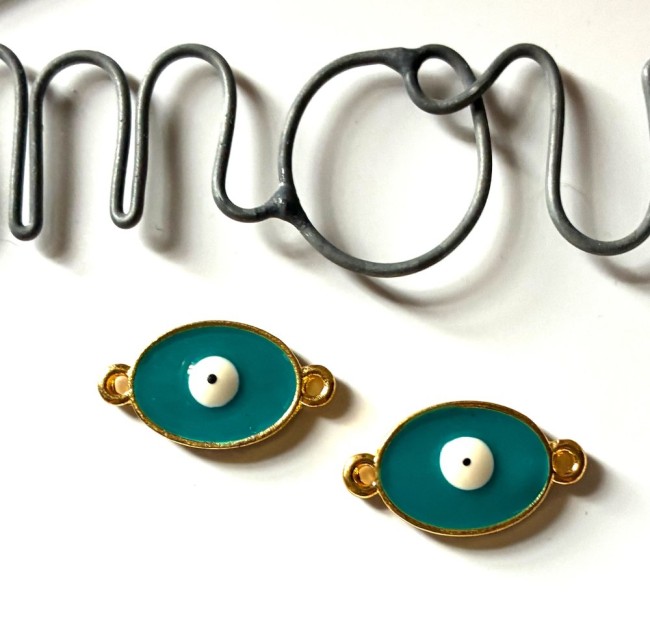 Ces deux perles plates avec deux piquots en métal doré, de forme ovale et représentant le symbole de l'œil de la chance mesurent 2x1cmd'autres coloris en boutique
