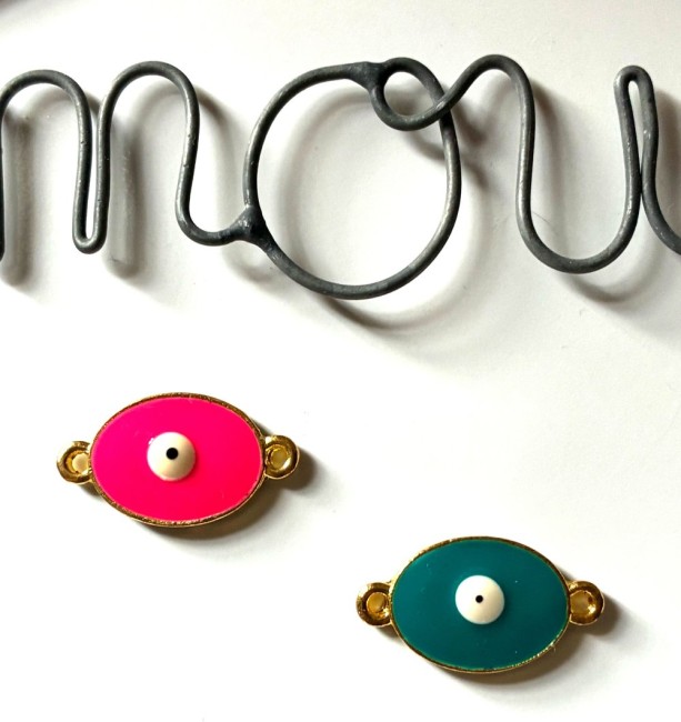 Ces deux perles plates avec deux piquots en métal doré, de forme ovale et représentant le symbole de l'œil de la chance mesurent 2x1cm